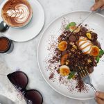 After her walk, she orders a full breakfast. She gets a breakfast plate, plus an oatmeal pancake, and she adds a cappuccino with coconut milk. Someone comments that it’s a lot of food, and the moment feels light and friendly.